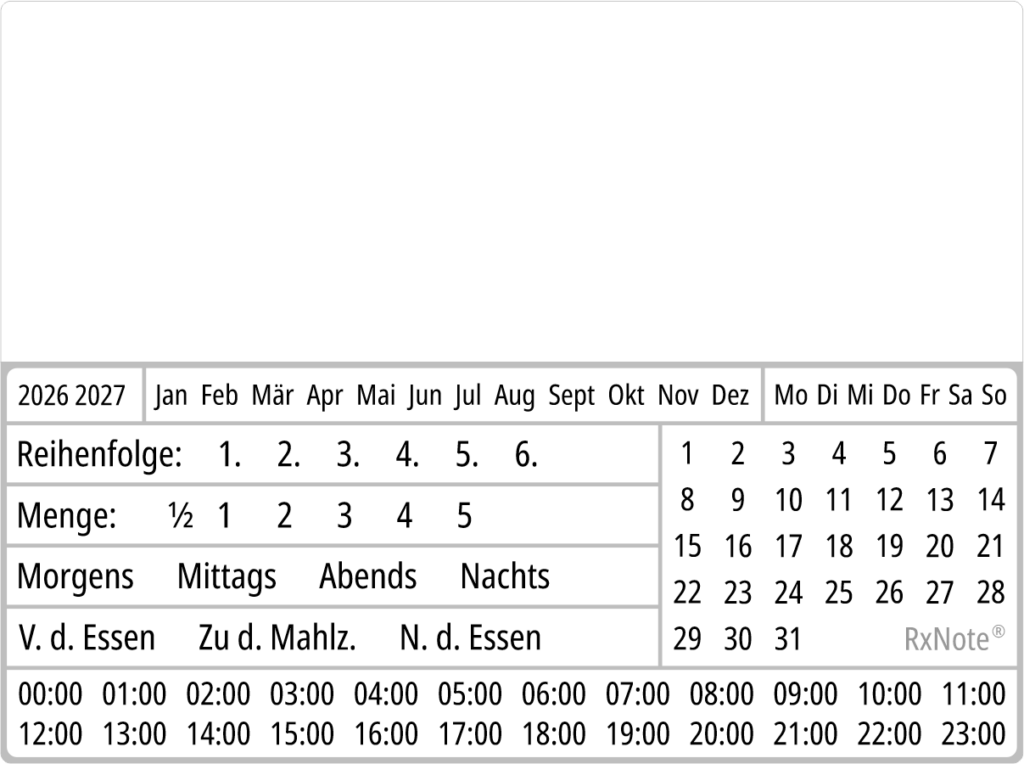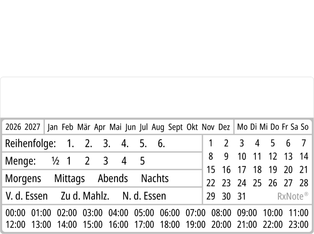 Um das Problem der Organisation der Medikamenteneinnahme anzugehen, haben wir den RxNote Pharmazeutischer Kalender entwickelt – die innovative und einfache Methode zur Verordnung und Einhaltung von Medikamenten, die zur Prävention von Dosierungsfehlern beitragen kann.