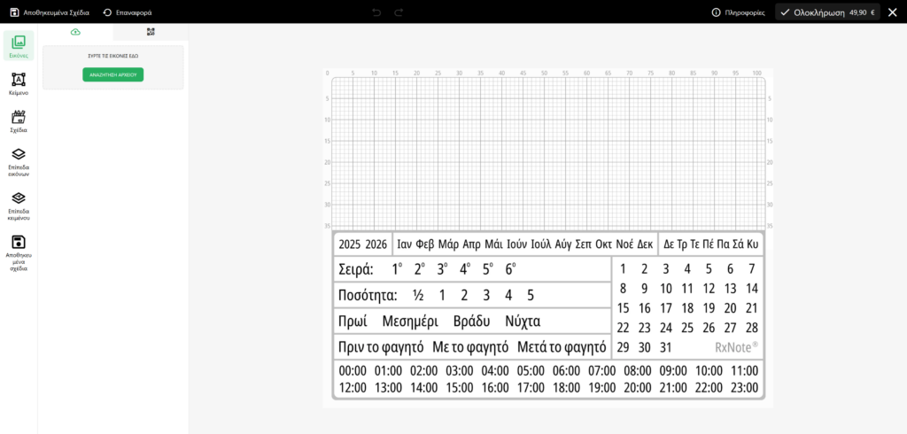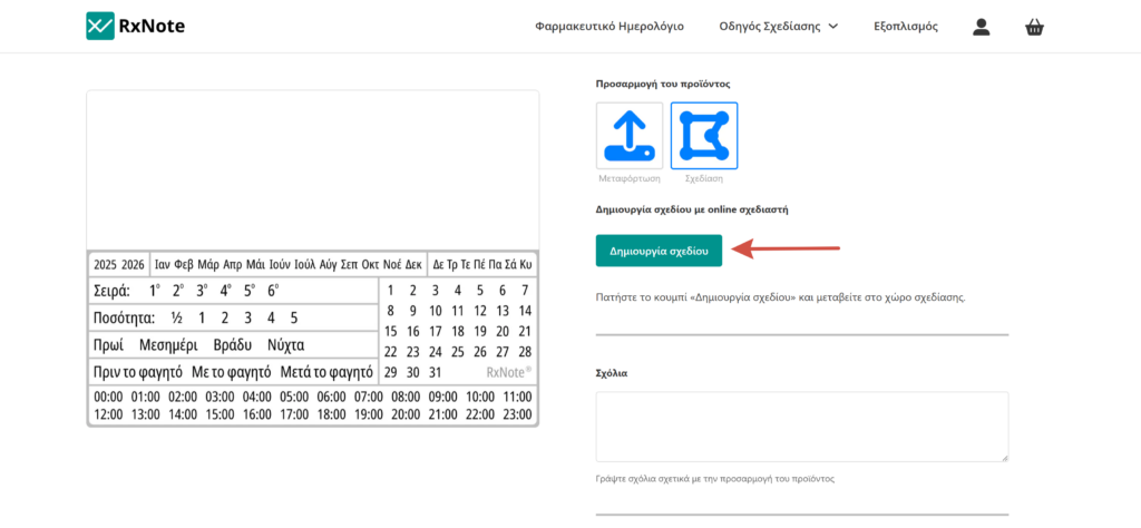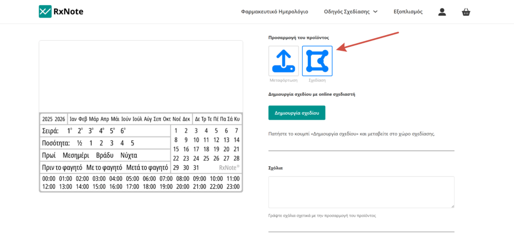 Το προϊόν προστίθεται στο καλάθι με το σχέδιο που δημιουργήσατε. Μετά την ολοκλήρωση της παραγγελίας το προσαρμοσμένο προϊόν θα επεξεργασθεί από τον σχεδιαστή μας με ειδικό λογισμικό και θα εκτυπωθεί στην αυτοκόλλητη ετικέτα με Φαρμακευτικό Ημερολόγιο RxNote.